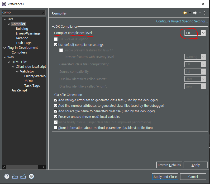 3. Java -> Compiler 탭 클릭시 해당 level이 몇 버전인지 확인 및 변경 가능