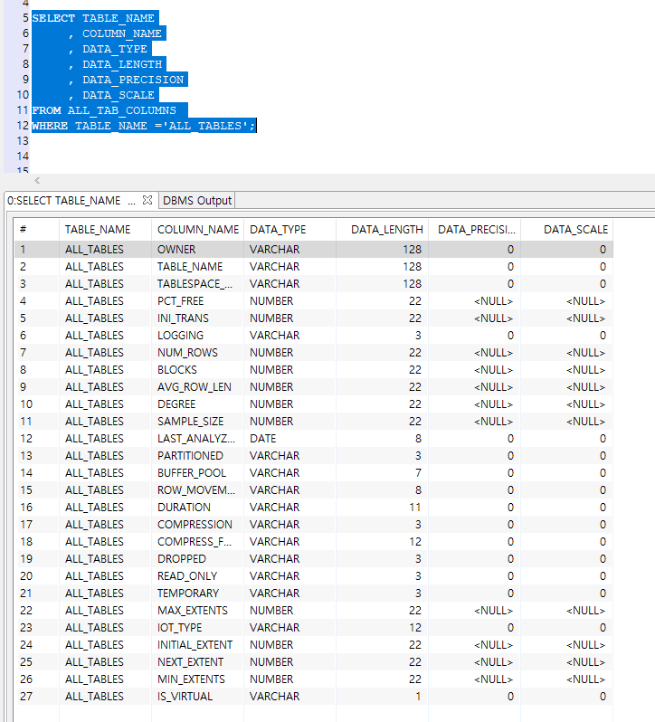 ex) SELECT * FROM ALL_TABLES;