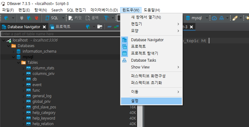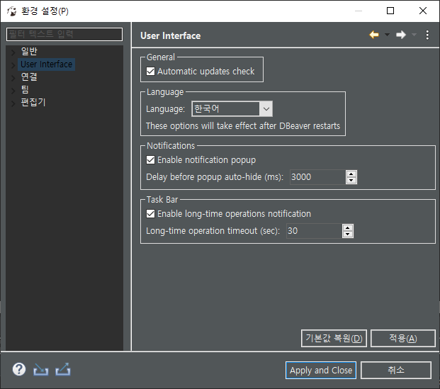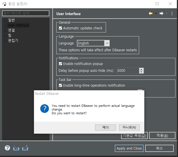 DBeaver(디비버)에서 한국어를 영어로 언어 변경하기
