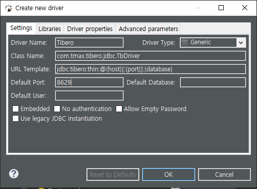 - URL Template : jdbc:tibero:thin:@{host}[:{port}]:{database}