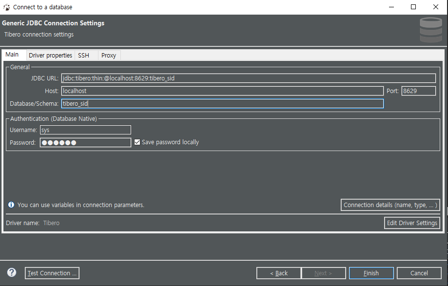 - example : jdbc:tibero:thin:@127.0.0.1:8629:tibero_sid (7번그림 참고)